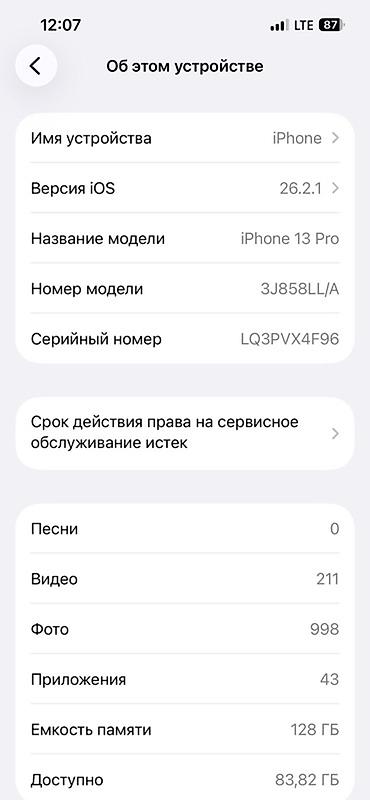 IPhone 13 Pro, 128 ГБ - Модель: iPhone 13 Pro (номер модели MLV93KH/A) - Память: 128 ГБ, свободно около 79,35 ГБ - iOS: версия 16.3 - Аккумулятор: максимальная ёмкость 82%, включена «Оптимизирован...