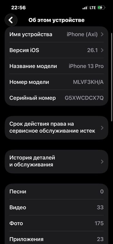 IPhone 13 Pro Max, 256 ГБ, цвет Silver. Характеристики и детали с устройства: - Название модели: iPhone 13 Pro Max (модель MLLC3B/A) - Память: 256 ГБ (доступно около 187,53 ГБ на момент снимка) - ...