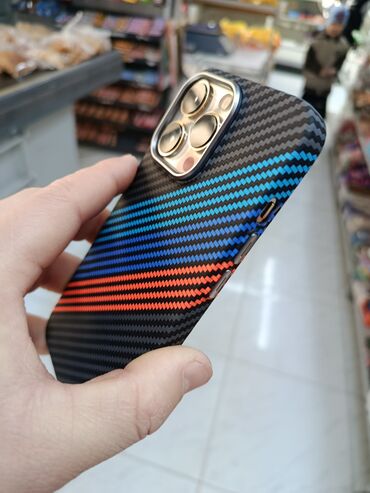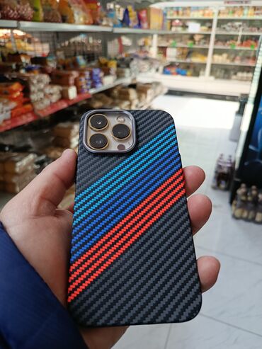 - Корпус в карбоновом стиле: чехол с диагональными синими и красными полосами, текстура под карбон, аккуратные вырезы под камеры и элементы управления