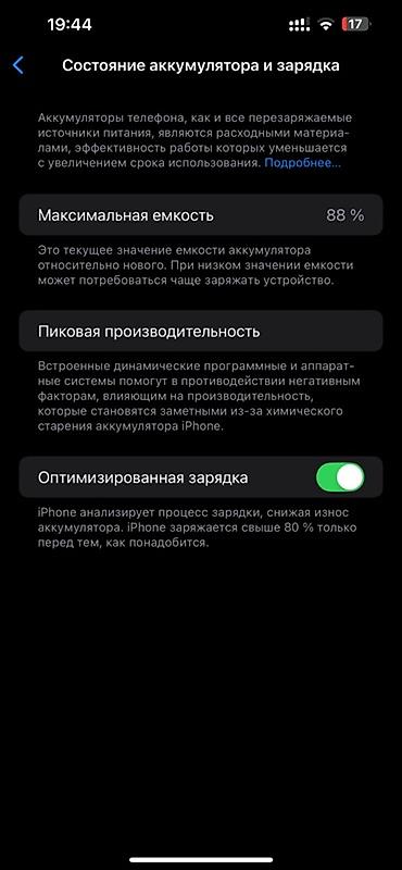 - Аккумулятор: максимальная ёмкость 88% (скриншот в галерее), включена «Оптимизированная зарядка»