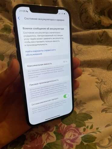 - Аккумулятор: в настройках отображается “Максимальная емкость 79%” и уведомление о необходимости сервисной замены для восстановления полной емкости.