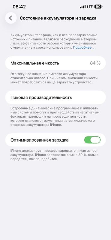 - Состояние аккумулятора по системе: максимальная ёмкость 84%, включена «Оптимизированная зарядка»