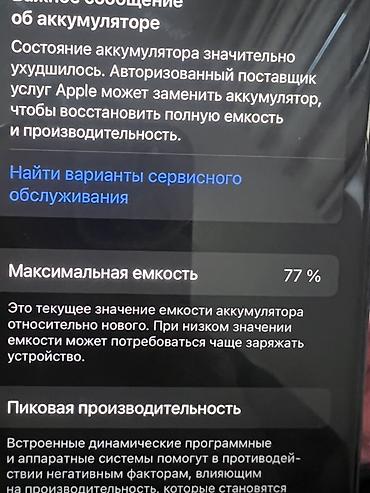 - Аккумулятор: максимальная емкость 77% (в настройках отображается важное сообщение о необходимости обслуживания)