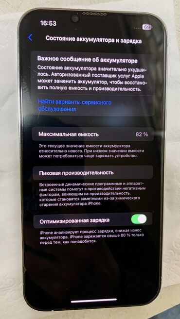 - Аккумулятор: максимальная ёмкость 82% (в системе отображается сообщение о необходимости сервисной замены для восстановления полной автономности)