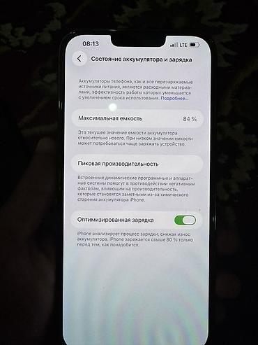 - Аккумулятор: максимальная ёмкость 84%, включена «Оптимизированная зарядка»
