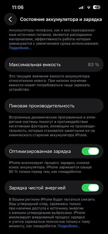 - На экране: «Состояние аккумулятора и зарядка» — максимальная ёмкость 83%,