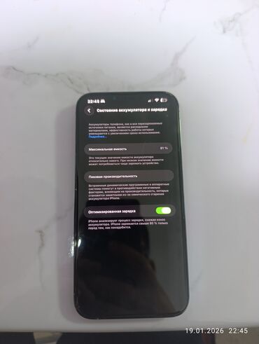 - На скриншоте «Состояние аккумулятора»: максимальная ёмкость 81%, включена «Оптимизированная зарядка»