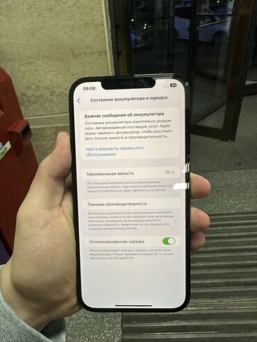 - В разделе «Состояние аккумулятора» отображается максимальная емкость 78% и уведомление о необходимости сервисной замены для восстановления полной емкости
