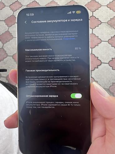 - Состояние аккумулятора в настройках: максимальная емкость 85%, включена «Оптимизированная зарядка»