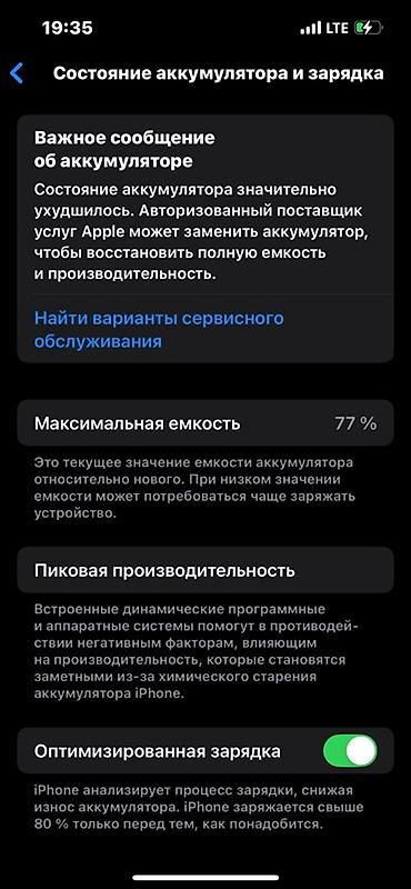 - Аккумулятор: в разделе «Состояние аккумулятора» отображается максимальная ёмкость 77% и уведомление о необходимости сервисной замены для восстановления полной ёмкости и производительности.