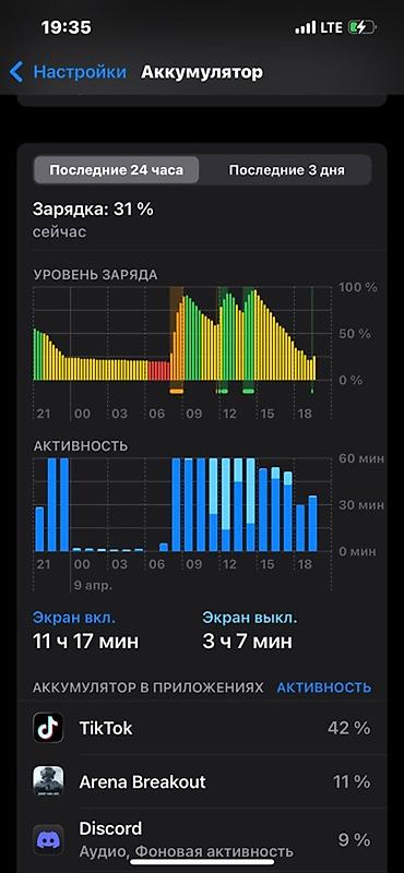 - На скрине «Аккумулятор» видно: активное использование, экран включён 11 ч 17 мин за сутки.