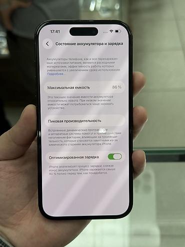 - Состояние аккумулятора по iOS: максимальная емкость 86% (оптимизированная зарядка включена)