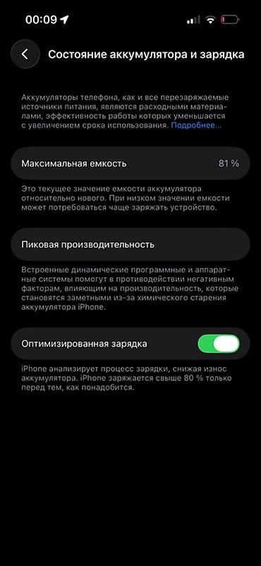 - Аккумулятор: максимальная ёмкость 81%, включена «Оптимизированная зарядка»