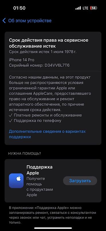 - В разделе «Об этом устройстве» отображается модель iPhone 14 Pro, номер модели 5Q1F3ZD/A, серийный номер D34VV6L7T6.