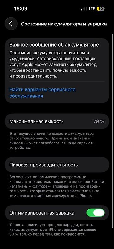 IPhone с OLED‑дисплеем , Face ID и вырезом Dynamic Island. На экране видно: раздел “Состояние аккумулятора и зарядка” с максимальной ёмкостью 80% и включённой функцией “Оптимизированная зарядка”. П...