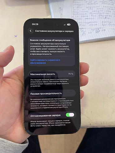 - Аккумулятор: максимальная ёмкость 75% (в разделе «Состояние аккумулятора и зарядка» отображается сообщение о рекомендованной замене для восстановления полной ёмкости и производительности)