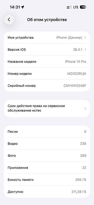 IPhone 14 Pro, 256 ГБ, чёрный Характеристики и особенности: - Модель: iPhone 14 Pro (номер модели MQ0T3KH/A) - Память: 256 ГБ (доступно ~232 ГБ) - Версия iOS: 16.4 (на фото в меню “Об этом устройс...