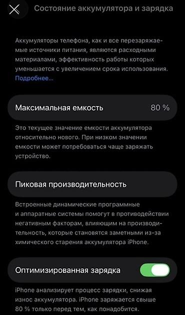 - Состояние аккумулятора по iOS: максимальная емкость 80% (см. скрин)