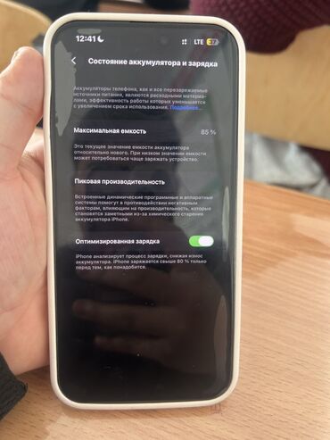 - Аккумулятор: максимальная ёмкость 85% (скриншот «Состояние аккумулятора и зарядка»), включена «Оптимизированная зарядка».