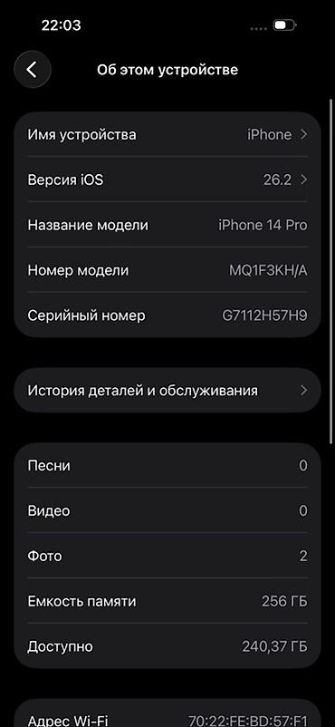 ОБМЕН не интересен IPhone 14 Pro, 256 ГБ, цвет Silver серебристый) Характеристики и детали: - Модель: iPhone 14 Pro (номер модели MQ103KH/A, на скриншоте «Об этом устройстве») - Память: 2...