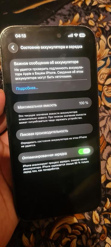 - Аккумулятор: в разделе «Состояние аккумулятора» отображается максимальная емкость 100%. Система показывает уведомление «Не удается проверить подлинность аккумулятора Apple…», в «Детали и обслуживание» — «Аккумулятор: Неизвестно».