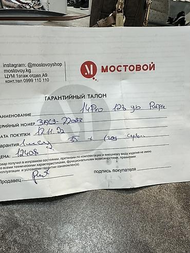 Продаётся Модель:. IPhone 14 Pro _________________________________ Характеристики: Дисплей: 6.1" OLED - 1179 x 2556 Чип: Apple A16 Bionic Камера: 4 (48 MP + 12 MP + 12 MP) Память: 128 гб Озу:...