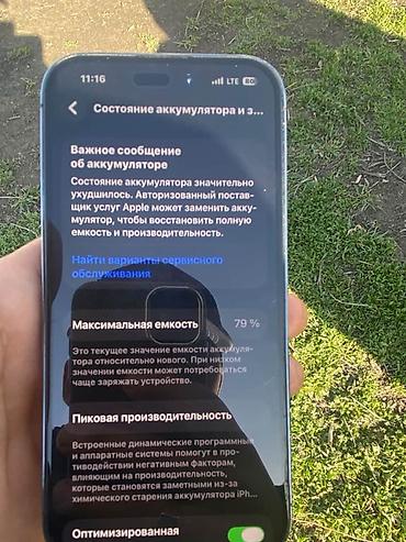 - Аккумулятор: в настройках показано «Максимальная ёмкость — 79%», присутствует уведомление о необходимости обслуживания для восстановления полной ёмкости и производительности.