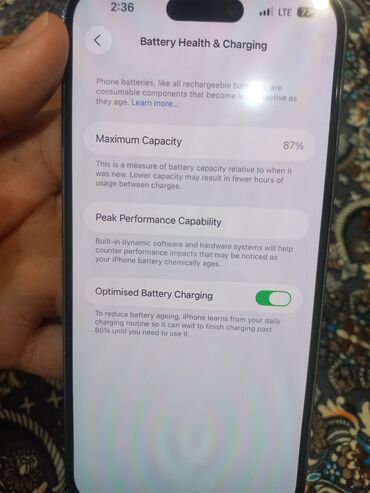 - Аккумулятор: максимальная ёмкость 87% (согласно разделу Battery Health & Charging)