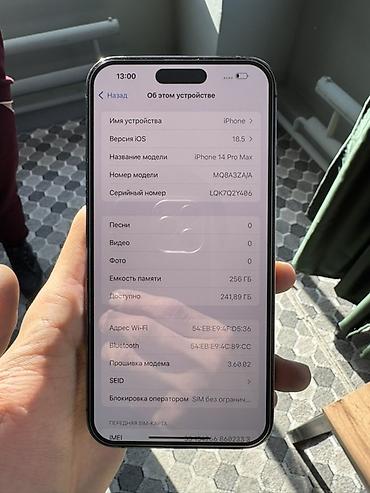 Смартфон на фото включен, демонстрируется экран «Об этом устройстве», рабочие камеры и интерфейс. Отличный вариант для тех, кому нужен флагман Apple с большим дисплеем, мощной камерой и емким хранилищем.