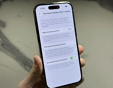 IPhone с OLED‑дисплеем , Face ID и вырезом Dynamic Island. На экране видно: раздел “Состояние аккумулятора и зарядка” с максимальной ёмкостью 80% и включённой функцией “Оптимизированная зарядка”. П...