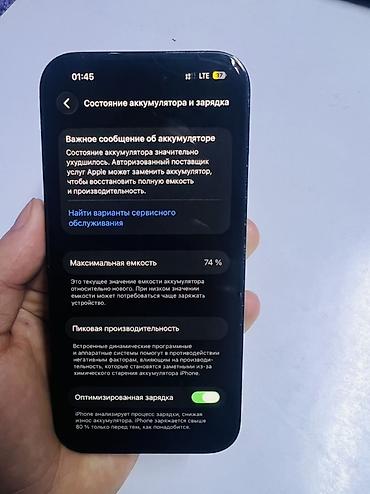 - Состояние аккумулятора по настройкам: максимальная емкость 74%, в разделе «Состояние аккумулятора» отображается сообщение о необходимости обслуживания; включена «Оптимизированная зарядка».