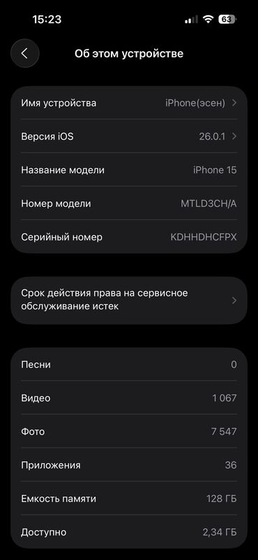 IPhone 15 Pro, титановый корпус. Характеристики: - Память: 512 ГБ (доступно около 496,9 ГБ) - iOS: 18.6.2 - Модель: MTV93KN/A (серийный номер на фото) - Аккумулятор: максимальная ёмкость 87%, сост...