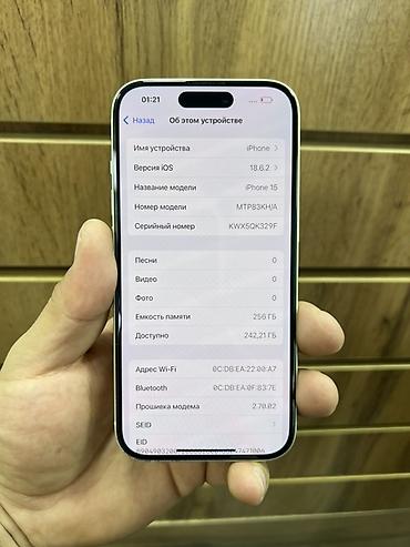 IPhone 15, 128 ГБ Основные параметры: - Модель: iPhone 15 (номер модели MTP03HN/A) - Память: 128 ГБ, свободно ~98,29 ГБ - iOS: версия 26.2 - Серийный номер: LKF6532NCN (отображается на скриншоте/ф...