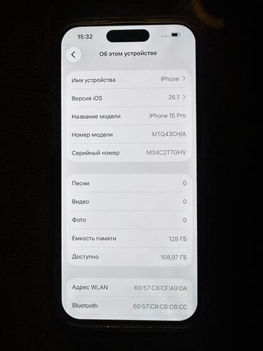 IPhone 15 Pro, титановый корпус. Характеристики: - Память: 512 ГБ (доступно около 496,9 ГБ) - iOS: 18.6.2 - Модель: MTV93KN/A (серийный номер на фото) - Аккумулятор: максимальная ёмкость 87%, сост...