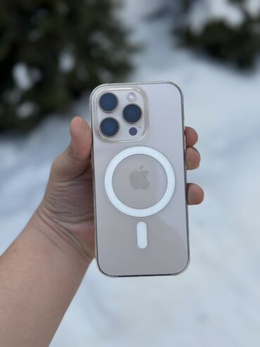 - Корпус: титановая рамка, задняя панель из матового стекла. На фото — светлый цвет. Установлен прозрачный чехол с поддержкой MagSafe.