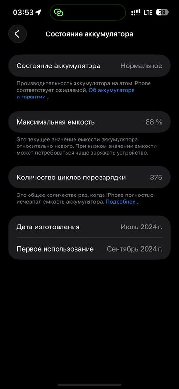 16 макс 256 ГБ 100% Есим Состояние нового Первое использование сентябрь 2025 Цикл заряда 115 раз Идеал состояние