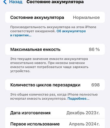 - Аккумулятор: максимальная ёмкость 86%, состояние «Нормальное»