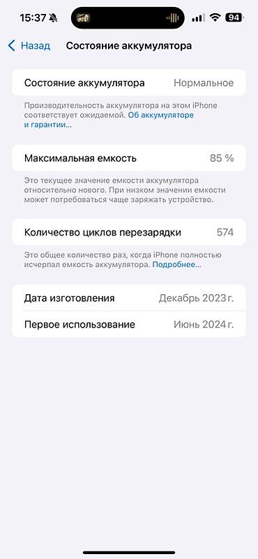 - Аккумулятор: состояние «Нормальное», максимальная ёмкость 85%, циклов перезарядки 574