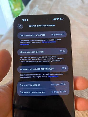 - Аккумулятор: состояние «Нормальное», максимальная ёмкость 86%, 805 циклов перезарядки