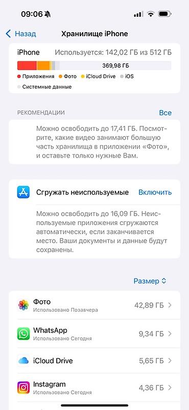 - Память: 512 ГБ (на скриншоте «Хранилище iPhone» видно 369,98 ГБ свободно).