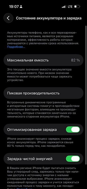 - Аккумулятор: максимальная ёмкость 82% (скриншот из «Состояние аккумулятора и зарядка» прилагается). Включены «Оптимизированная зарядка» и «Зарядка чистой энергией».