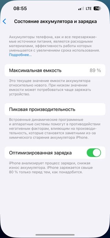 - Максимальная емкость: 89% (скрин из «Состояние аккумулятора и зарядка»)