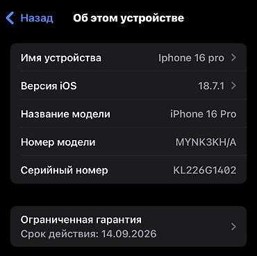 📱 iPhone 16 Pro 128GB ✨ Оригинал, без ремонтов все в родне 🔋 Аккумулятор 93% 💾 Память 128 ГБ 📅 Гарантия до 13.05.2026 📱 iOS 26.3 📸 Face ID, камеры, True Tone — всё работает идеально 🔥 В идеальном ...