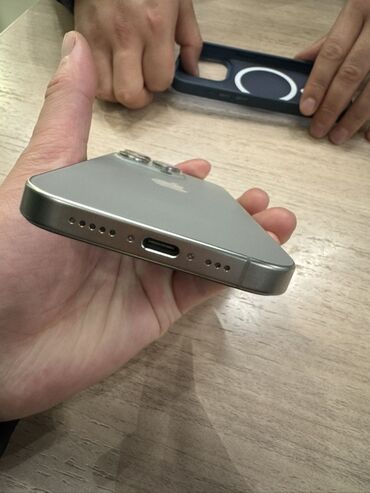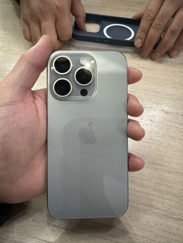 На фото видно комплектный чехол с магнитным кольцом MagSafe. Экран без вырезов кроме Dynamic Island, задний блок камер с защитными металлическими окантовками. Отличный выбор для фото/видео, игр и ежедневных задач, легкий и прочный благодаря титану.