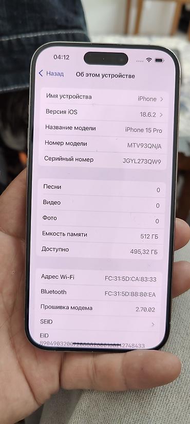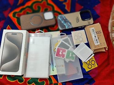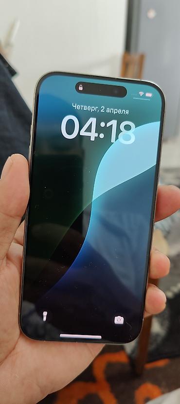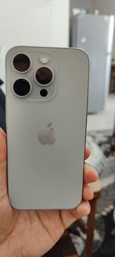 IPhone 15 Pro, цвет Titanium (светло‑серый). Диагональ 6.1", экран OLED с Dynamic Island. Корпус из титана, плоские грани, разъём USB‑C.