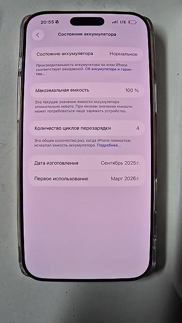 - В разделе аккумулятора указано: дата изготовления батареи — сентябрь 2025 г., первое использование — март 2026 г.