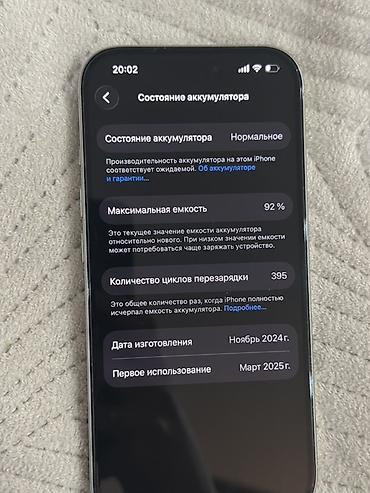 - Аккумулятор (скриншот в галерее): состояние «Нормальное», максимальная ёмкость 92%, 395 циклов перезарядки; дата изготовления устройства — ноябрь 2024, первое использование — март 2025.