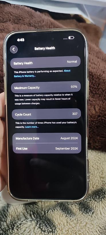 - Аккумулятор: состояние батареи — Normal; максимальная ёмкость 93%; количество циклов 307