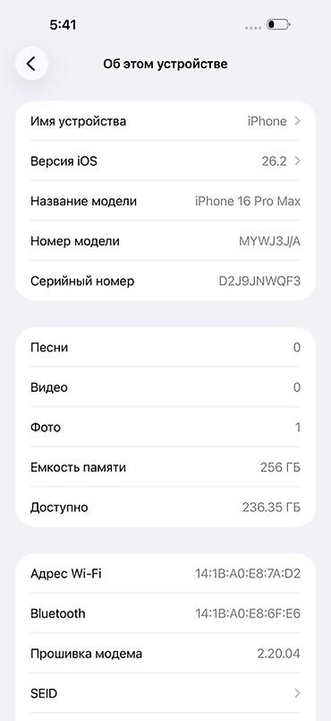 - Модель: iPhone 16 Pro Max (номер модели MYWJ3J/A по скриншоту “Об этом устройстве”).