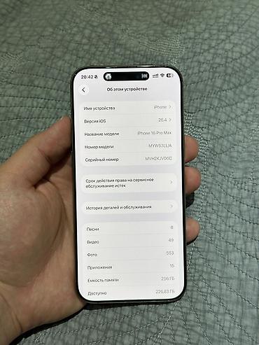 IPhone 16 pro max 256gb в отличном состоянии покупали новым ничего не менялось все работает четко с коробкой документами Состояние аккумулятора 93%,цвет desert titanium,1sim+esim, зарегистрирован,г...